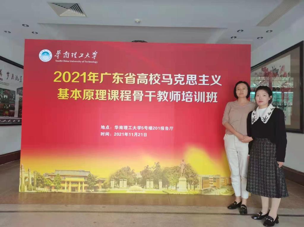 【本网讯】11月21日,由广东省教育厅和广东省高校思政课区域协同创新中心主办、华南理工大学马克思主义学院承办的2021年度广东省高校马克思主义基本原理课程骨干教师培训在华南理工大学举行。为进一步提升beat365思想政治理论课教师的专业素养与综合素质,积极践行学校“德学”教育思想和“五进”教育实践活动,马克思主义学院选派马克思主义基本原理教研室主任杨丽丽和马丽洁两位青年教师代表参加了此次培训。