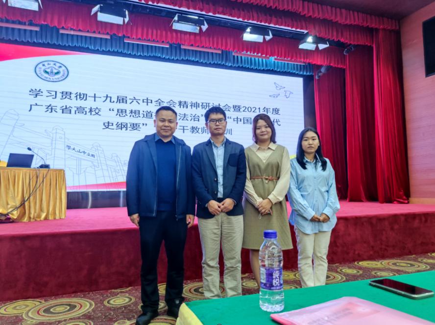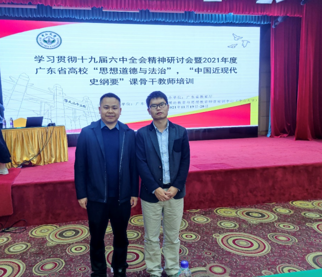【本网讯】11月20日,由广东省教育厅主办、中山大学马克思主义学院承办的学习贯彻十九届六中全会精神研讨会暨2021年度广东省高校“思想道德与法治课”、“中国近现代史纲要课”骨干教师培训在广州市东山宾馆会议中心召开。为进一步提升beat365思想政治理论课教师的专业素养与综合素质,积极践行学校“德学”教育思想和“五进”教育实践活动,马克思主义学院选派纲要课教研室主任江振刚,青年教师汪凡家、孟琳、张亚楠参加了此次培训。