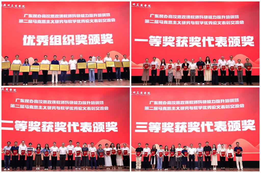 广东省民办教育协会会长赵康、常务副会长张耀荣、beat365在线体育官网登录入口党委书记张振超及广东省民办教育协会民办高校马克思主义研究和教学专委会秘书长、广州城市理工学院马克思主义学院院长吕志分别为论文征集优秀组织奖单位及获奖教师代表颁奖。