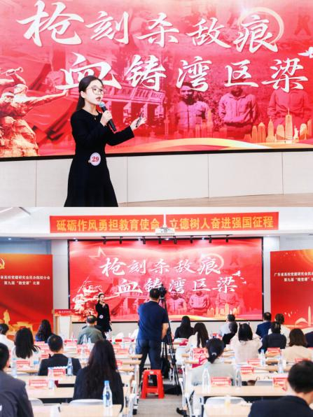 比赛现场,叶桐润老师以《枪刻杀敌痕,血铸湾区梁》为主题,立足粤港澳大湾区深厚的红色根脉,通过“一把枪、一位英雄”的独特视角,深情讲述了抗日英雄“刘黑仔”(刘锦进)带领港九大队夜袭启德机场、营救美军“飞虎队”飞行员克尔中尉的传奇故事。