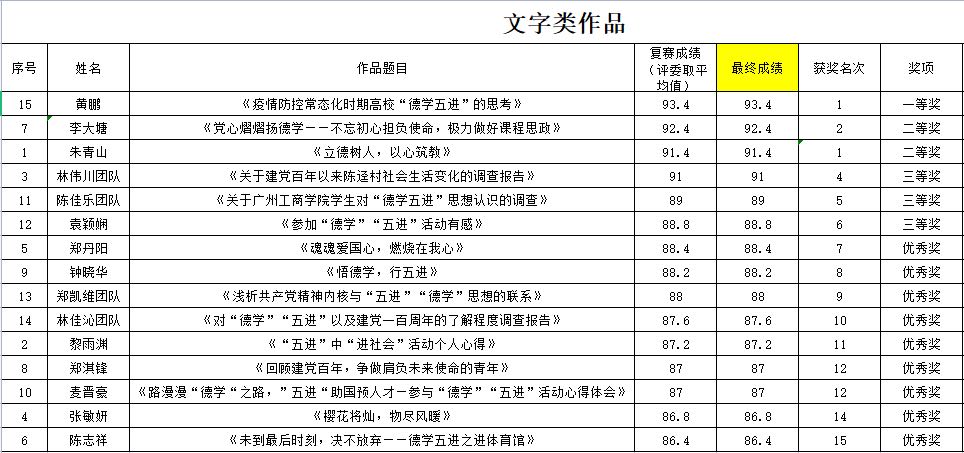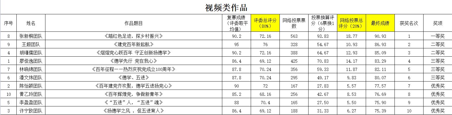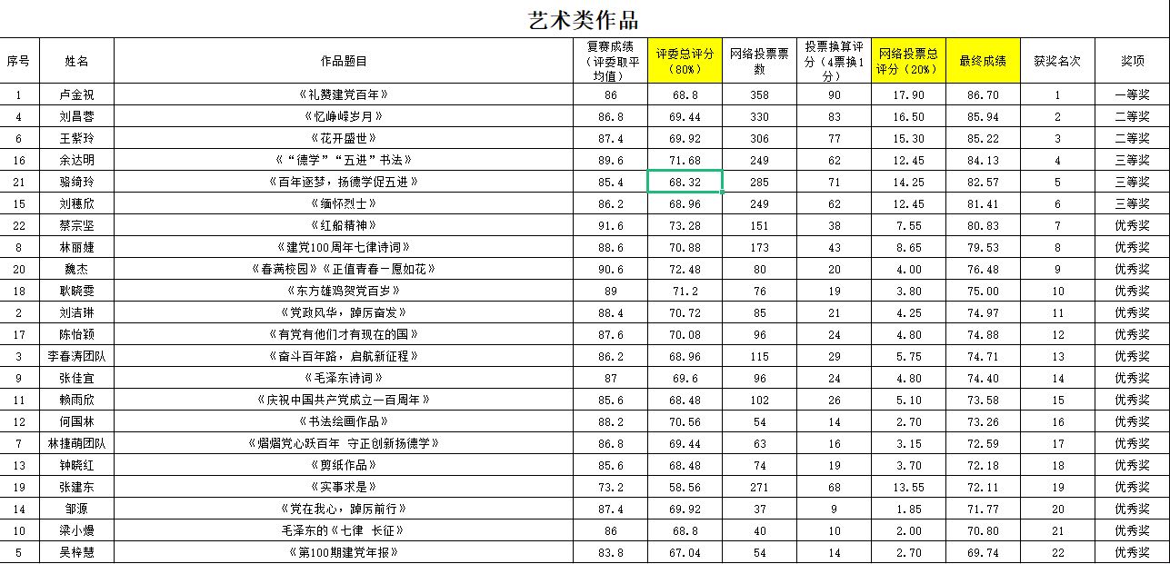 同时,专家组评委对入围的47幅作品进行打分。作品的最终分数由评委团分数的80%和投票分数的20%组成,并最终得出获奖名单。艺术类作品:一等奖获得者卢金祝;二等奖获得者刘昌蓉,王紫玲;三等奖获得者刘穗欣,余达明,骆绮玲。文字类作品:一等奖获得者黄鹏;二等奖获得者朱青山,李大塘;三等奖获得者林伟川团队,陈佳乐团队,袁颖娴。视频类作品:一等奖获得者张新桐团队;二等奖获得者胡瑾儒团队,王超团队;三等奖获得者廖佳逸团队,潘文炜团队,林晓绵团队。其余29名参赛选手获得优秀奖。