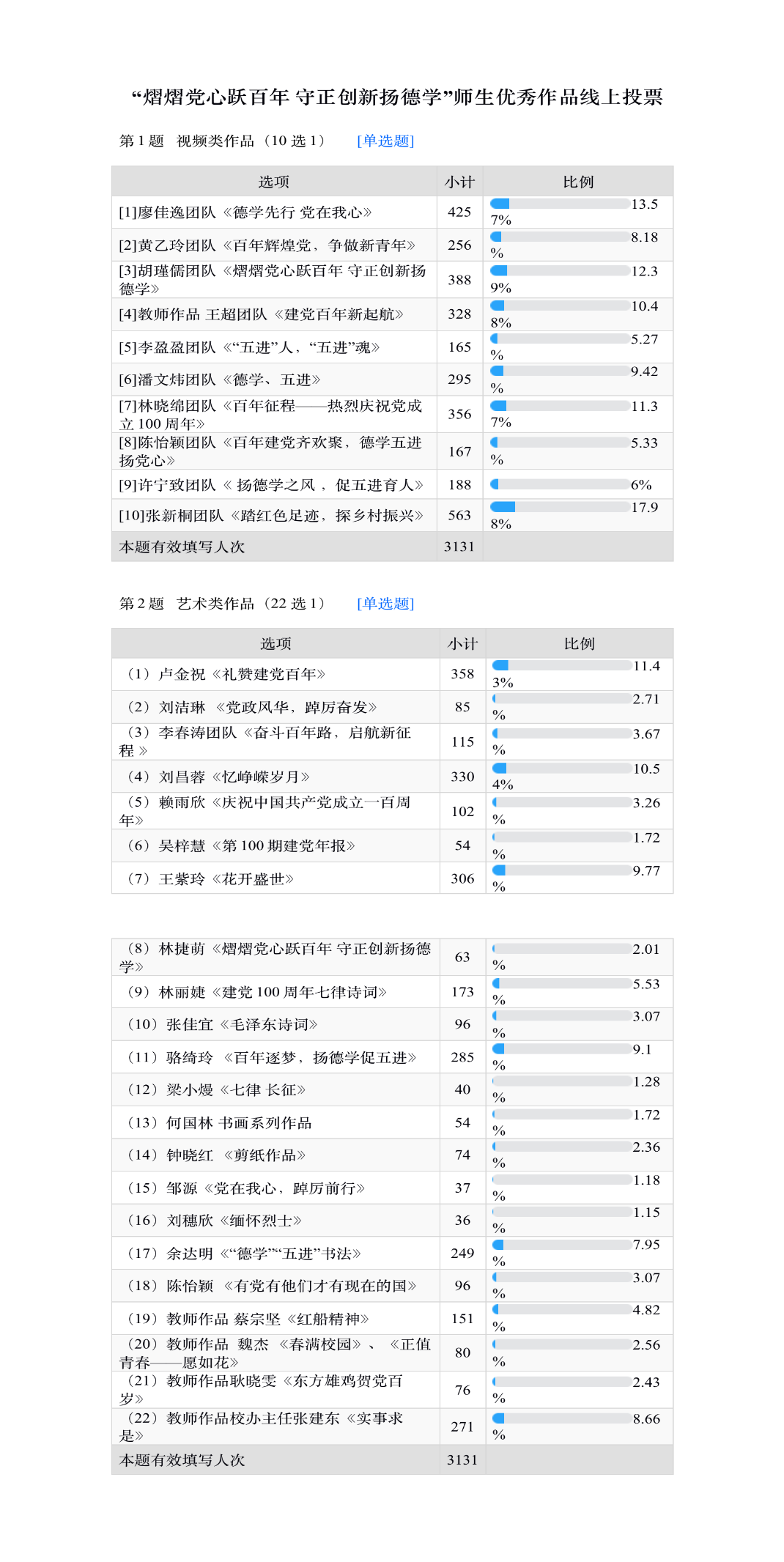 本次活动中,作品类别分为艺术类、文字类和视频类,经教师审核团队的初次筛选,共有艺术类作品22份、文字类作品15份、视频类作品10份进入决赛。5月28日—6月2日,入围的艺术类和视频类作品在马院微信公众号进行线上展示及投票,文字类作品则由专家组评委进行评分,不参与投票环节。