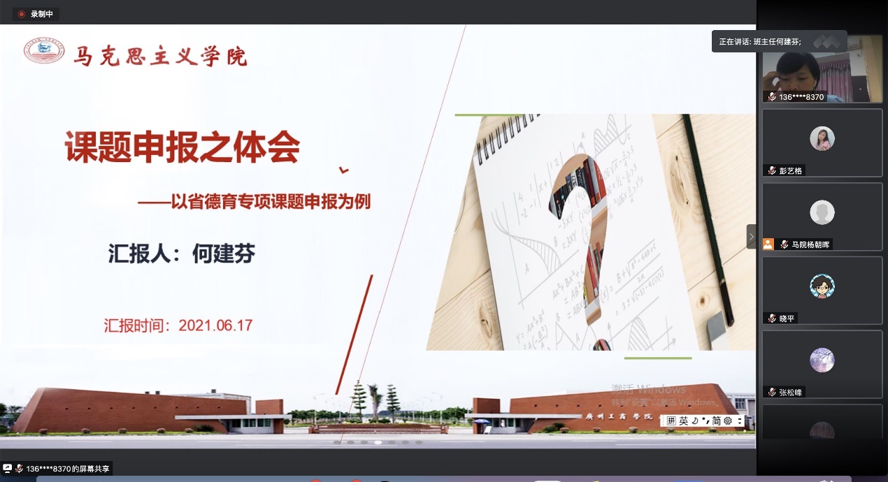 教研会第一项议程为科研经验交流。首先由何建芬老师热情地作了题为“科研项目申报个人体会——以省级德育专项课题成功申报为例”的科研经验分享报告。何建芬老师是马克思主义学院的骨干教师,科研成果较为丰硕,经验相对丰富,尤其近几年在项目申报上成绩突出。会上,何老师结合自身项目申报经历,毫无保留地分享自己的心得,主要在课题申报选题、内容框架、创新点、修改四个重点方面进行了有针对性的介绍。其中,何老师认为在申报课题之前学术积累极为重要,厚积薄发才能做好选题,要多看文献,避免重复研究;多写论文,心中有研究;具体拟定题目时要注重时代性、政治性、地域性、特色性;课题申报可以从学科上、理论上、思想上、思路上、对象上、问题上、方法上等方面提出创新点;要注意观点的凝练、集中、醒目、简明,力避平庸,忌表达失当及说大话、空话等等。此外,何老师还提出科研申报过程中应秉持“只顾耕耘,少问收获”等心态。何老师的分享干货满满、切中青年教师申报时的困惑点、痛点,与会的青年教师们听罢深受启发,倍受鼓舞。