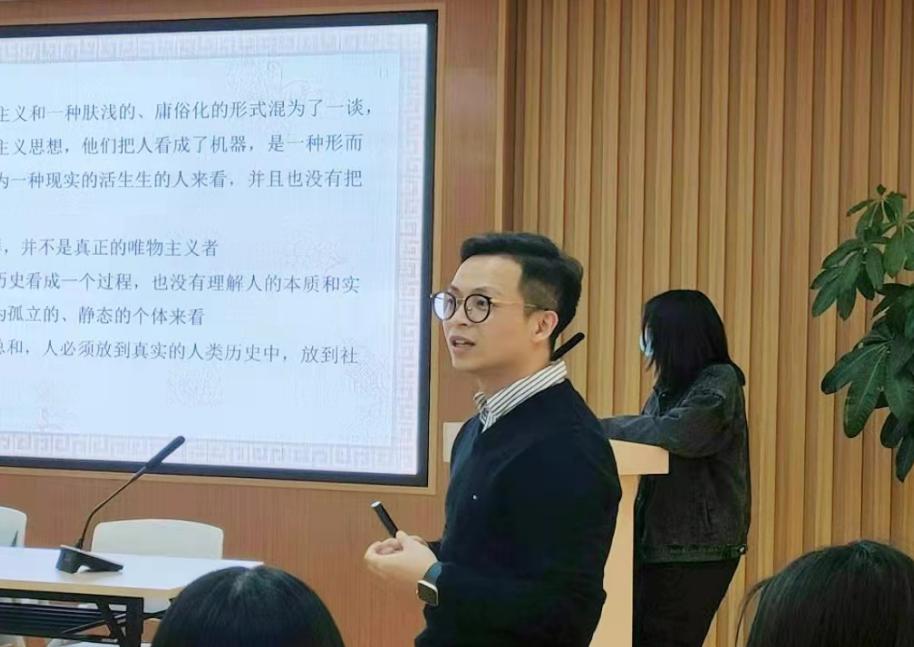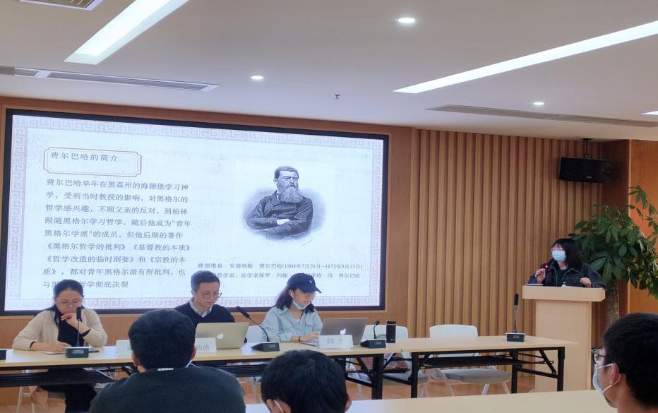 【本网讯】为贯彻落实学校“以德为行 以学为上”教育思想,积极践行“五进”教育实践活动,进一步加强青年大学生思想文化建设,11月14日晚,马克思主义学院大学生马克思主义理论研究读书会活动第三十一期:“马克思对费尔巴哈的批判”在三水校区图书馆六楼新时代党员讲习所举行,会议由马院李功清老师主持,周欣婷同学主讲,闫安老师与孟蕴老师进行了点评与交流。(主要参考书籍:赵敦华《西方哲学简史》)