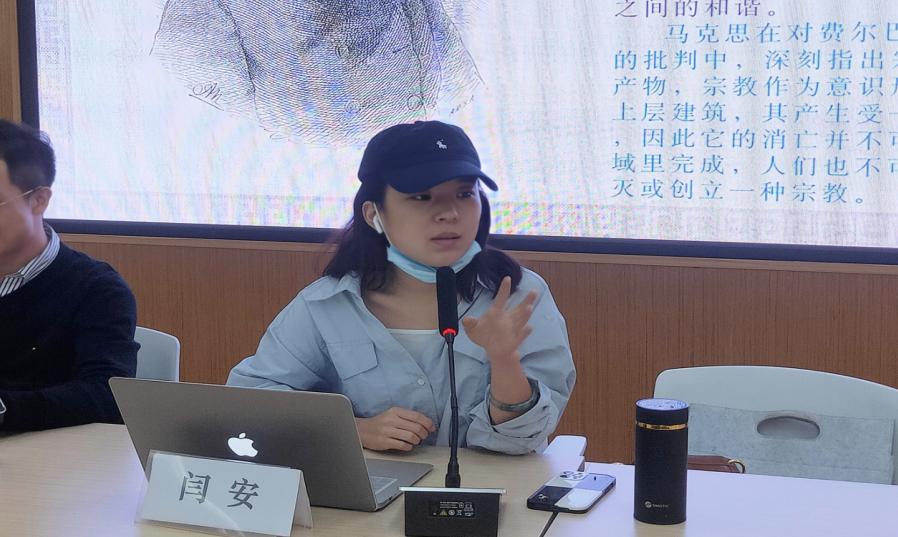 会议伊始,周欣婷同学就费尔巴哈哲学思想的缘起与转向,以“马克思对费尔巴哈的批判”为题,从马克思对费尔巴哈批判的核心为切入点,并以马克思对费尔巴哈宗教思想的批判为例,论述了马克思对费尔巴哈的批判主要体现在两个方面:一方面马克思认为费尔巴哈的唯物主义和一种肤浅的、庸俗化的形式混为了一谈,费尔巴哈只是对“抽象的人”的崇拜,并不是真正的唯物主义者;另一方面,马克思认为费尔巴哈没有把历史看成一个过程,也没有理解人的本质和实践活动的意义,费尔巴哈把人作为孤立的、静态的个体来看。