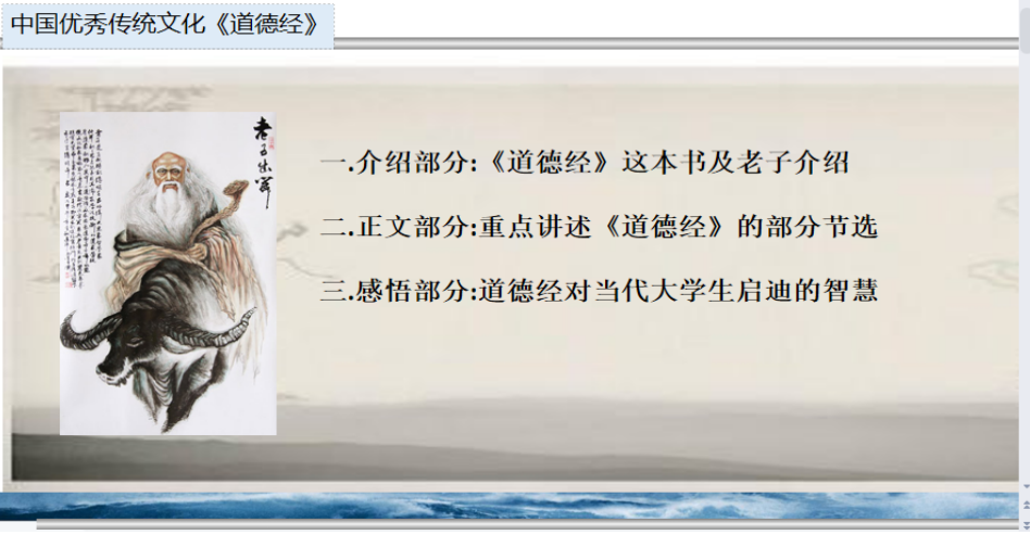 唐副教授重点对《道德经》进行了三个方面的导学:一是介绍《道德经》及其作者;二是解读《道德经》的重点章节,三是分享感悟:道德经对当代大学生具有启迪的智慧。在第二部分导读重点章节时,主要是学习原文,讲解译文,拓展阐释。通过原文与译文的对照解释,力图帮助克服害怕古文晦涩难懂的心理障碍,提升同学们阅读理解原文的能力。而在拓展阐释时,引导同学们要联系当代社会现实的思想渊源以加深对内容的认知与理解,重点突出传统经典中的名言名句在指导大学生做人做事时的现实指导意义,并强调辩证地分析与对待经典中的部分观点,注重创新性的转化与运用。