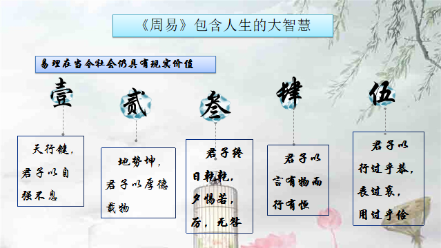 《周易》用一个符号推演系统生动地揭示了天地万物和人生祸福的演化规律,而且还说明了“物极则反”的特点。唐副教授强调《周易》不是算命迷信的书,它有一定的科学道理,教会我们如何认知世界,是中国文化的智慧源泉,正所谓“易道广大,无所不包,旁及天文地理、乐律、兵法、韵学、算术,以逮方外之炉火,皆可援易以为说”。她建议同学们通过记忆八卦取象歌,了解复卦64卦,384爻的基本知识,逐步领悟“无极生太极,太极生两仪,两仪生四象,四象生八卦,八卦定乾坤”的内涵,并借助教学视频重点解说了乾卦与坤卦的卦爻辞。她还推介同学们在自学期间着重钻研易理,也即《周易》所包含的人生哲理,并举例说明了若干条重要的卦中包含的至理。