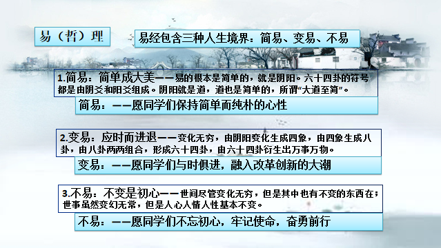 最后唐副教授以《周易》中陈述的三种人生境界“简易、变易、不易”进行解说,并以此勉励同学们在今后的人生道路上,按“简易之理”保持简单而纯朴的心性;按“变易之理”坚持与时俱进,积极投身改革创新的大潮;按“不易之理”坚持不忘初心、牢记使命,奋勇前行。