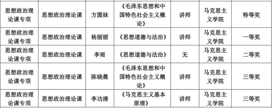 5月19日,在学校举办的广东省第六届青年教师大赛校级选拔赛中,马院青年教师发挥稳定,表现优秀,包揽了思政组所有的奖项。方圆妹老师荣获思政组特等奖,杨丽丽老师荣获一等奖,李雨老师荣获二等奖,陈晓晨与李功清老师荣获三等奖。学校拟推荐方圆妹、杨丽丽两位老师继续参加省级比赛的角逐。