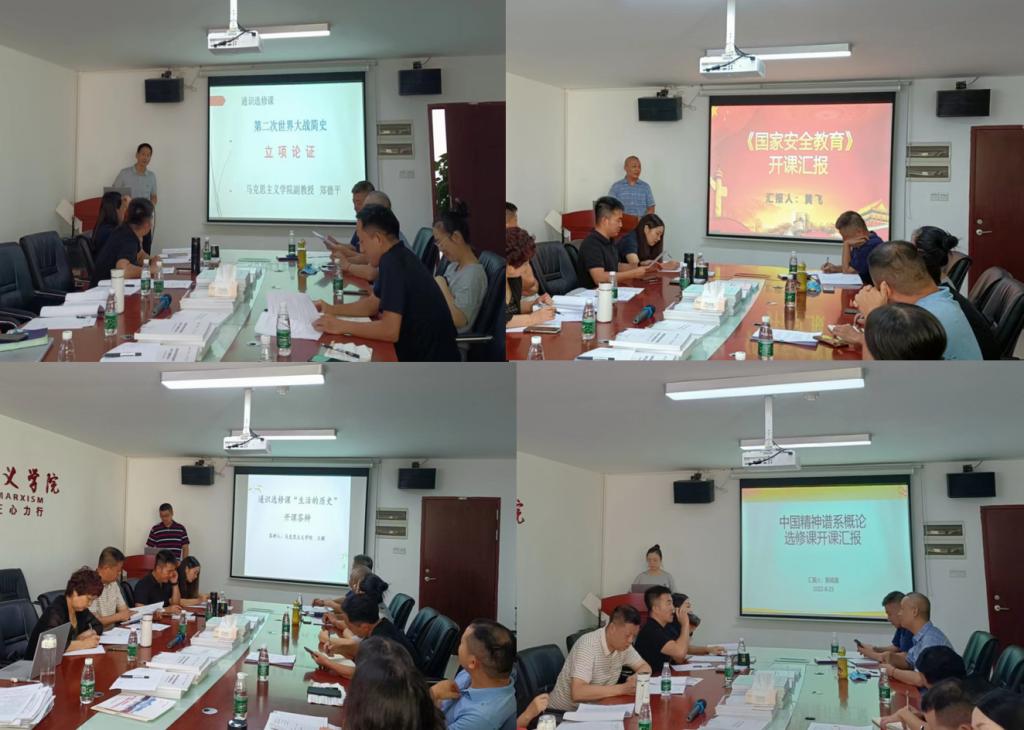 为推进学校选修课程体系建设,丰富学生选课资源,进一步做好新学期新增通识选修课的设置工作,8月23日上午,马克思主义学院在院部楼424会议室召开了2022-2023学年第一学期新增通识选修课程论证会。会议由马克思主义学院常务副院长周静副教授主持。学院教学指导委员会成员参会。
