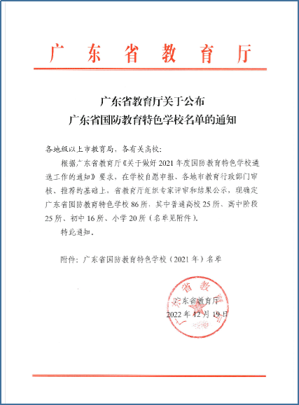 近日,广东省教育厅公布了《广东省国防教育特色学校名单的通知》,确定86所学校为广东省国防教育特色学校,其中普通高等学校(本科院校)8所,beat365成功入选并位列第五。