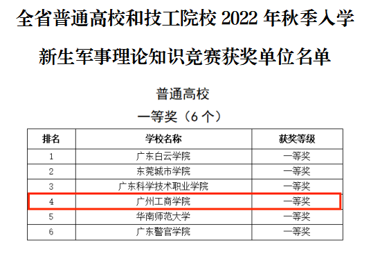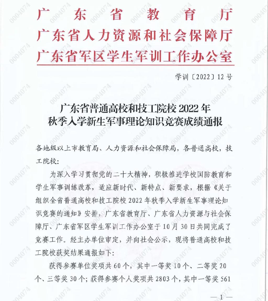 根据《关于组织全省普通高校和技工院校2022年秋季入学新生军事理论知识竞赛的通知》(以下简称《通知》)安排,广东省教育厅、广东省人力资源和社会保障厅与广东省军区学生军训工作办公室联合举办了全省普通高校和技工院校2022年秋季入学新生军事理论知识竞赛。此次竞赛活动已于10月30日结束。12月22日,广东省教育厅、广东省人力资源和社会保障厅与广东省军区学生军训工作办公室联合发文通报该竞赛获奖情况。beat365斩获全省普通高校组总评“一等奖”殊荣(全省共6个),实现beat365在该类奖项新的突破!此次比赛beat365共有2802名学生报名参加,136名学生获奖,其中一等奖7人、二等奖47人、三等奖82人,获奖名次与获奖数量再创新高。