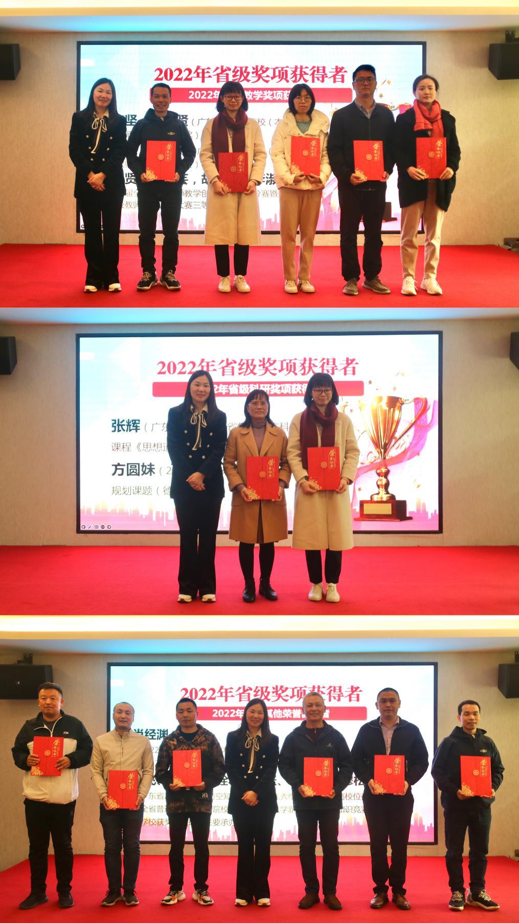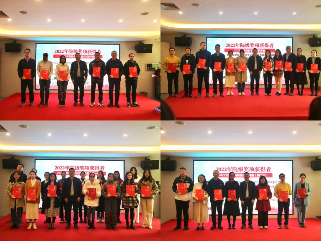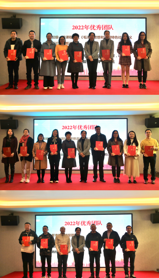 会议的第二流程是颁奖环节。此次颁发的奖项包括了2022年马院突出贡献奖、2022年马院科研突出贡献奖、2022年院级、校级、市厅级和省级奖项获得者以及优秀团队奖等。学院对获奖集体和个人进行了现场表彰,勉励台上获奖教师不忘初心、再创辉煌。