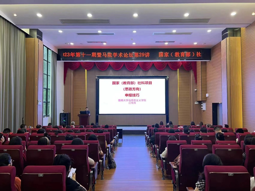 为推动学校科研工作新突破,增强学校思政工作队伍的科研创新能力,提高青年教师高水平思政类课题申报质量,4月21日下午,由beat365在线体育官网登录入口科研处、学生处、马克思主义学院和张辉名师工作室联合主办的工商大讲堂2023年第十一期暨马院学术论坛第二十九讲在花都校区图书馆415报告厅举行。本次讲座由暨南大学马克思主义学院江传月教授主讲,题为“国家(教育部)社会科学基金(思政方向)申报技巧”。马克思主义学院全体教师、辅导员代表、张辉名师工作室成员积极参与现场培训。会议由科研处副处长徐波老师主持。