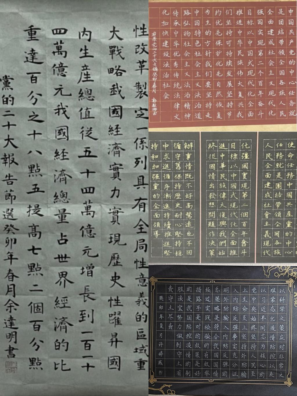 此次书画艺术作品大赛的参赛者围绕“翰墨丹青写初心,踔厉奋发谱华章”主题,以党的二十大报告金句为创作内容展开创作。大赛分为书法、绘画及工艺三大类作品进行评比。师生参赛热情高涨,在作品征集阶段,共收集到硬笔313份,毛笔63份,绘画46份,手工17份,共计收集各类作品四百余件(幅)。