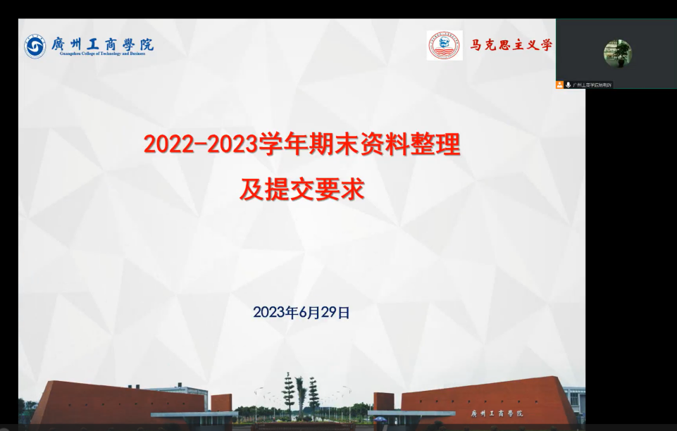 为了贯彻落实学校和马克思主义学院关于期末工作的各项要求,顺利完成本学期期末教学资料整理和归档工作,进一步提升教学质量,马克思主义学院思想道德与法治教研室于6月29日晚20:00召开了2022-2023学年第二学期期末资料整理工作会议,会议通过腾讯会议在线召开,会议由教研室主任杨朝晖副教授主持,教研室全体成员参加了会议。