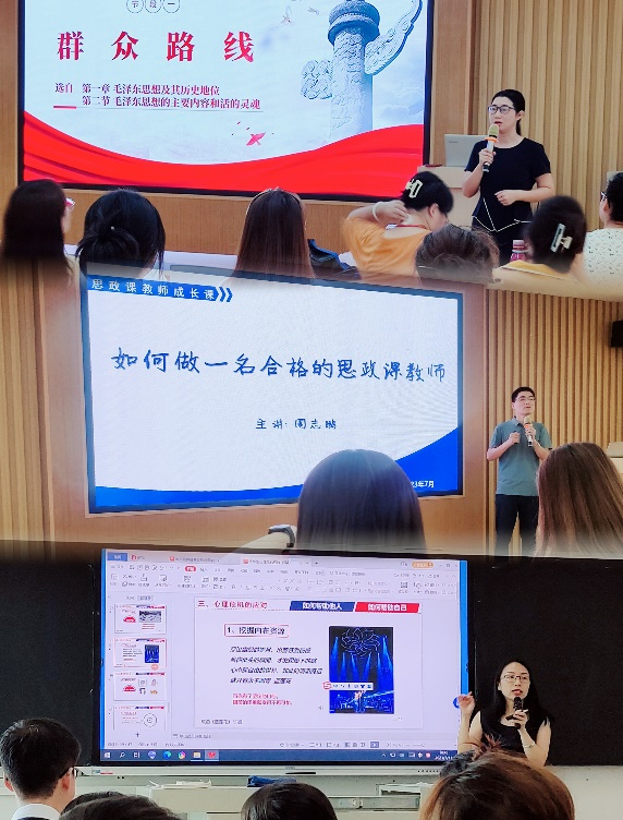 为进一步增强新进教师的岗前培训实效,夯实教学基本功,马院安排了教学观摩和竞赛经验分享。马院特邀广东省第五届高校青年教师教学竞赛一等奖获得者周志鹏老师为新入职教师作《如何做一名合格的思政课教师》的分享。他寄语青年教师“君子务本,本立而道生”,我们应坚定理想信念,并做到真学、真信、真懂、真用马克思主义。马克思主义学院院长助理、党总支宣传委员谭丽婷老师以“群众路线”为题为新入职教师带来了一节精彩的《毛泽东思想和中国特色社会主义理论体系概论》课程示范课。谭老师清晰的知识框架、独特的小组展示环节以及融入诗歌体裁内容为现场营造了一个欢快的互动氛围。她还分享了刚获得省高校思政课青年教师基本功大赛一等奖的心得,真诚的鲜活的历程鼓舞了现场老师们。广东省第六届高校青年教师教学竞赛二等奖获得者骆思贤老师在开课前展开小组讨论,通过理论阐释、案例分析、应对策略等方法进行说课,在科研创新中将思政元素、汉语言文学题材同心理教育有效融合,让学生在看、听、想、说的过程中更好地理解课程内容。