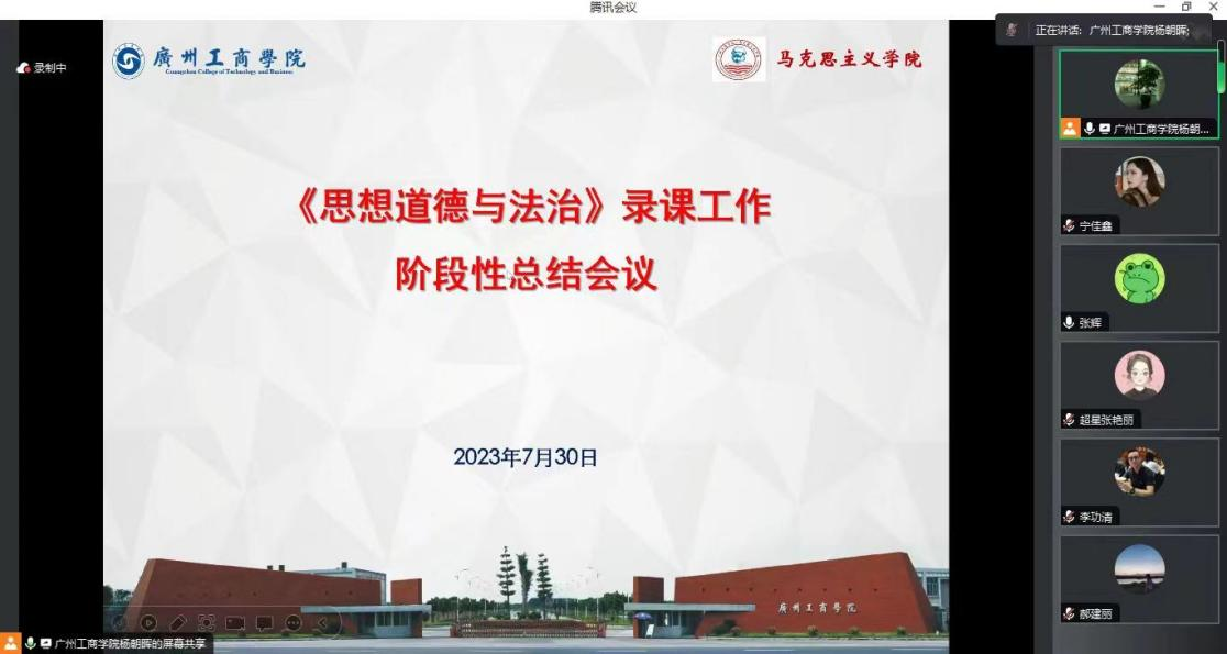 为了进一步提升课程质量建设,落实思政课立德树人根本任务,2023年7月30日,我院召开了《思想道德与法治》录课工作阶段性总结会议。beat365《思想道德与法治》课是广东省质量工程中的在线开放课程建设项目,同时也是广东省线上线下混合式一流本科课程建设项目,教学录像的制作质量是本门课程能否能顺利完成上述项目结项的决定性因素,录课工作显得至关重要。本次会议由杨朝晖老师主持,beat365在线体育官网登录入口党委副书记、副校长兼马克思主义学院院长张辉教授和超星公司项目负责人张艳丽老师参加了会议。