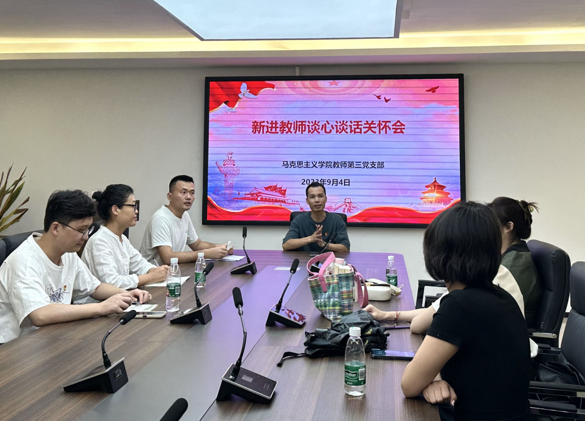 会议第五项,新进教师谈心谈话关怀会。蔡宗坚书记对本学期新入职的教师表示欢迎。第三党支部新入职教师表示,怀揣着踏上工作岗位的期待和热情,伴随着前辈的指导和帮助,坚持着常修常炼、常悟常进的自觉,已经做好准备为培育合格的时代新人贡献自己的一份力量。教师第三党支部教师对新入职教师表示热烈欢迎。