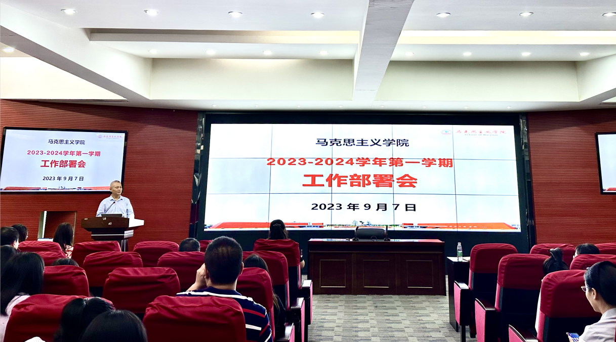 会议第二项议程是由马克思主义学院黄飞副院长和谭丽婷院长助理作新学期工作部署。首先由黄飞副院长介绍本学期的教学工作、学科建设和科研工作。教学工作方面,黄副院长详尽细致地从教学准备工作、教学实施、课程建设及教研室建设等方面进行说明。并强调落实教学质量是生命线的要求,教师要严格规范课堂教学和教学材料,齐心协力做好本科教学合格评估的相关工作。科研与学科建设方面,要求老师们做好课题申报、论文写作等基本工作,马院将继续发挥学科优势,举办高质量学术论坛,提高马院的学术影响力。
