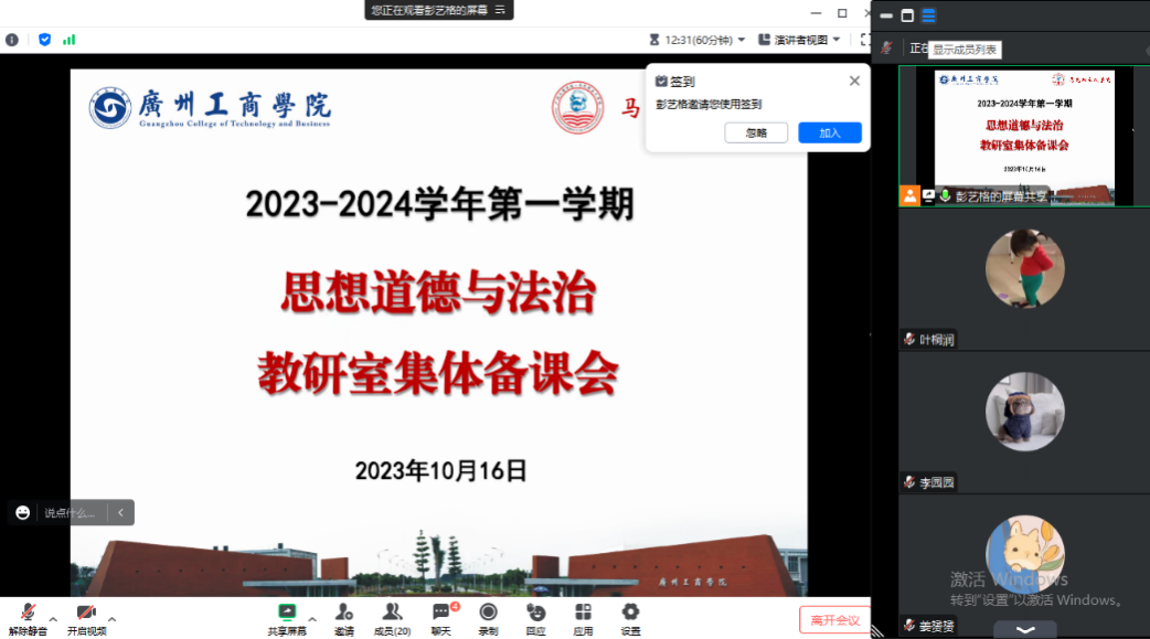 为了更好开展《思想道德与法治》课程教学工作,提升思政课教师教育教学质量,马克思主义学院思想道德与法治教研室在2023年10月16日于线上召开集体备课会。