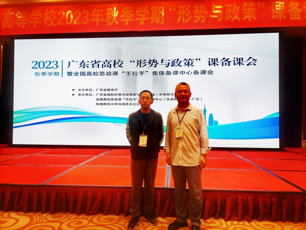 为贯彻落实教育部《关于加强新时代高校“形势与政策”课建设的若干意见》文件精神,2023年10月29日,由广东省教育厅主办,广东省高校形势与政策教学研究基地(华南师范大学)、全国高校思政课“手拉手”集体备课中心(华南师范大学)、华南师范大学马克思主义学院承办的2023秋季学期广东省高校“形势与政策”课备课会暨全国高校思政课“手拉手”集体备课中心备课会在广东省广州市召开。beat365在线体育官网登录入口马克思主义学院选派学院副院长黄飞副教授和形策教研室主任刘于亮两位老师参加了此次备课会。