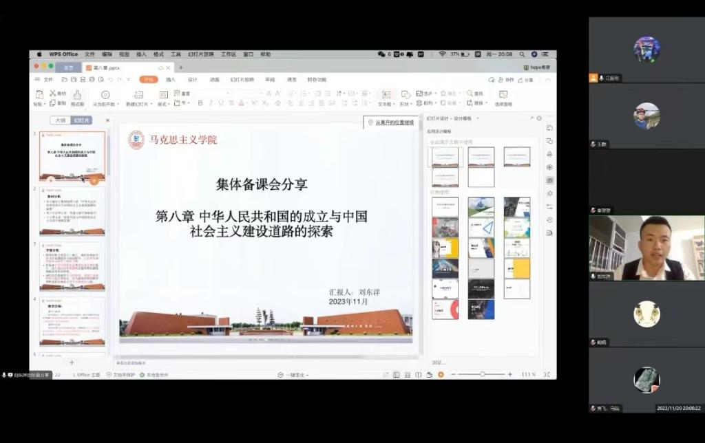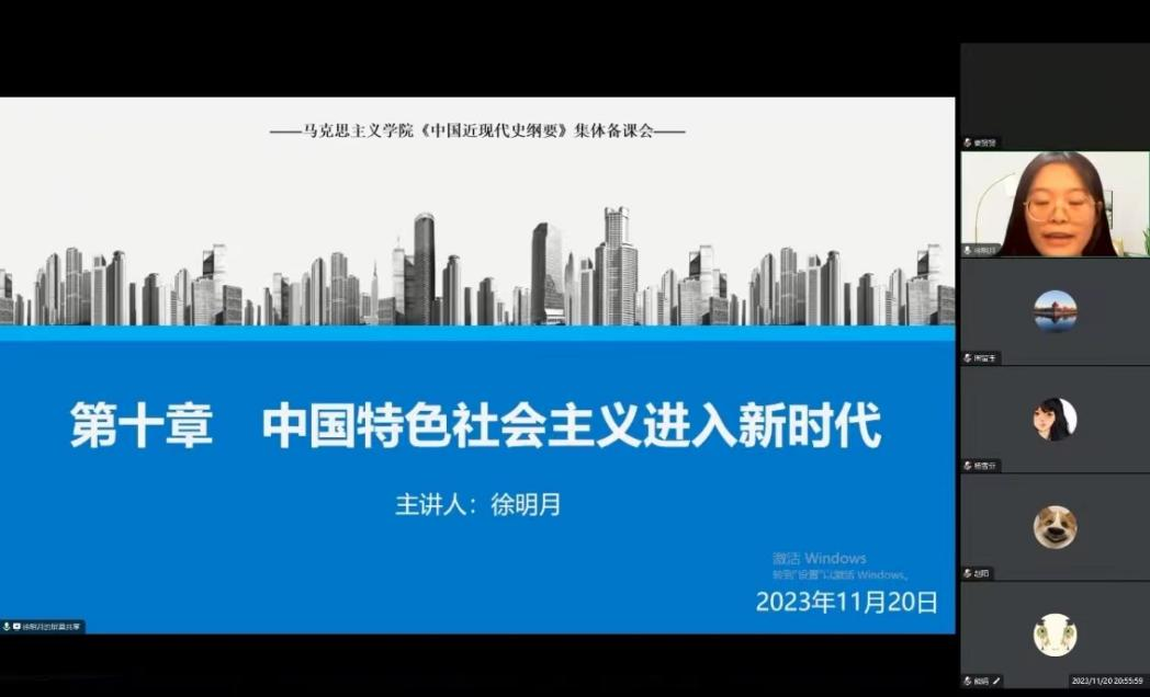 为进一步提高思政课教学质量,营造良好教学研究氛围,推动教研室建设与课程建设。11月20日晚,马克思主义学院中国近现代史纲要教研室以腾讯会议的形式召开了秋季学期第三次“中国近现代史纲要”课程集体备课会,本次备课会由教研室主任江振刚老师主持,全体任课老师参加。