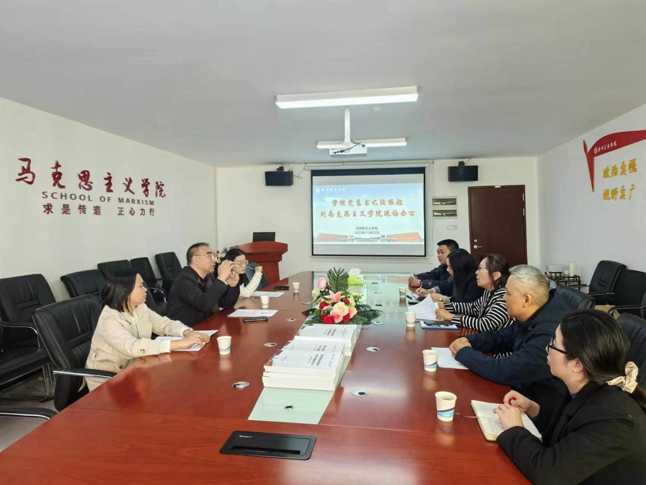 为深入学习习近平新时代中国特色社会主义思想,贯彻落实《普通高等学校马克思主义学院建设标准(2023年版)》文件精神,2023年11月21日上午,学校党委书记张振超一行到马克思主义学院召开现场办公会,对学院的建设发展情况进行深入调研和指导。校党委办公室、党委组织部相关负责人,马克思主义学院党政领导班子成员参会。