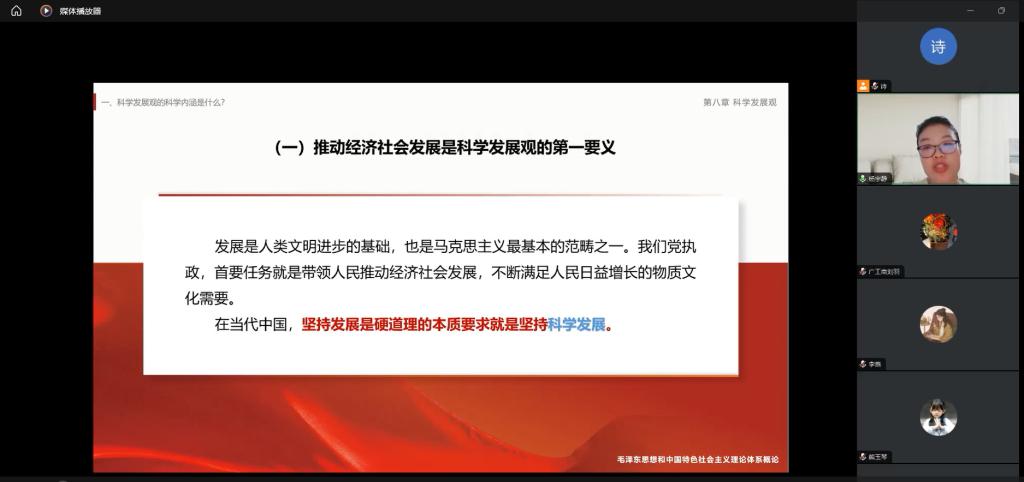 活动第三阶段,教研室于12月16日19:30开展线上教学示范课活动。示范课内容为《毛泽东思想和中国特色社会主义理论体系概论》第八章第一节“科学发展观的科学内涵”,由马克思主义学院朱青山副教授主讲。朱教授结合自身丰富的教学经验和实践,详细阐述了课程的教学目标、教学内容、教学思路、教学方法等,通过案例分析、课堂互动等多种形式,引导学生深入思考和理解教学内容。本次示范课为教师们充分展示了何为扎实的教学基本功、深厚的理论功底、开阔的教育视野和精湛的教学能力。让每一位教师都感受到了“研课”的效果、“磨课”的魅力,做到了在研磨中共同学习、成长。