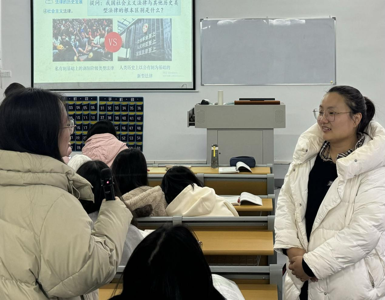 彭艺格老师本次现场教学所讲授的内容为第六章第一节“社会主义法律的特征和运行”和第二节“坚持全面依法治国”。首先,彭艺格老师以是什么、为什么、怎么做对本章节内容进行梳理,教学以我国古代神兽“獬豸”导入,引起学生们的兴趣,阐释“灋”的起源,从而引入新课。其次,彭艺格老师在讲授“法律的历史发展”问题时,以“原始社会有法律吗?”引发学生们的思考。逐步引出奴隶制法律、封建制法律、资本主义法律以及社会主义法律的一系列变迁,在讲授过程中与教材优秀案例“关于林木盗窃法的辩论”进行融合,通过多媒体短视频播放增强视听成效。最后,彭艺格老师在讲述坚持走中国特色社会主义法治道路必须遵循的原则时,以“权大还是法大?”作为课堂讨论,引导学生对中国特色社会主义法治道路进行自主讨论,从而系统阐述坚持走中国特色社会主义法治道路必须要坚持中国共产党的领导;坚持人民主体地位;坚持法律面前人人平等;坚持依法治国和以德治国相结合的基本原则。
