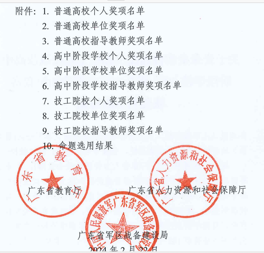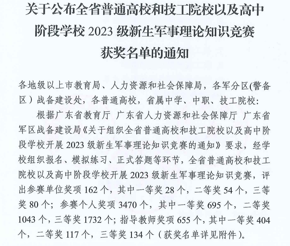 根据《关于组织全省普通高校和技工院校以及高中阶段学校开展2023级新生军事理论知识竞赛的通知》安排,近日,广东省教育厅、广东省人力资源和社会保障厅、广东省军区战备建设局公布了2023级新生军事理论知识竞赛的获奖结果,beat365荣获普通高校二等奖,十名同学荣获一等奖、七名同学荣获二等奖,八名同学荣获三等奖,beat365军事理论课程教研室穆松、胡刚两位老师荣获指导教师一等奖,获奖名次与获奖数量再创新高。