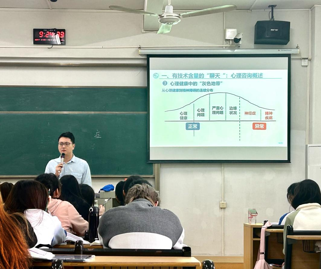 在介绍不同类型的精神障碍时,胡副教授巧妙结合心理学研究成果和生动有趣的咨询案例,为学生们揭开了心理正常与异常之间的神秘面纱。他清晰地指出,心理正常与异常的分界线在于是否有明显的躯体症状,而神经症与精神障碍之间的区别则在于行为意识是否与客观事实相符。胡副教授深入浅出的讲解,不仅让学生们对心理学知识有了更为全面和深入的了解,更消除了他们对心理咨询的刻板印象以及对心理障碍患者的偏见。通过整节课的学习,学生们深入了解了与精神障碍相关的心理知识,并对心理咨询有了更为清晰和正确的认识。