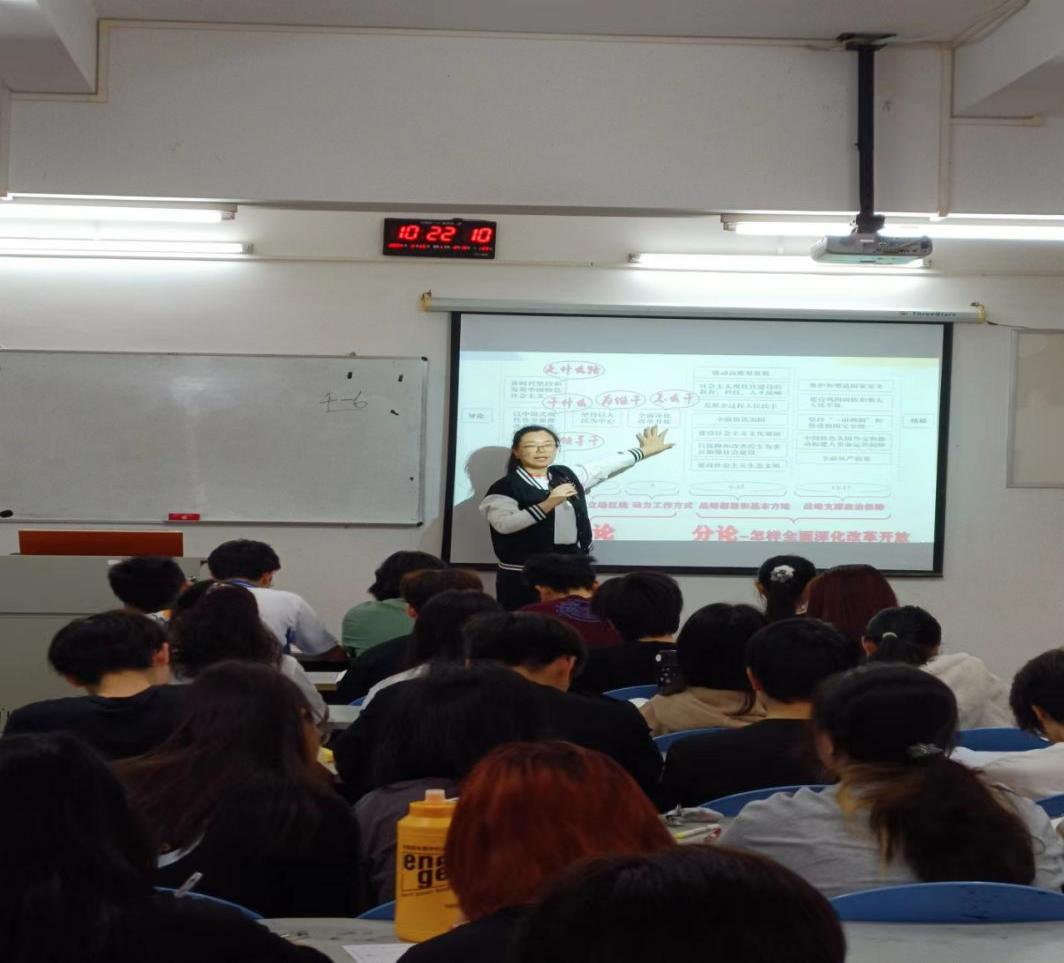 首先,陈博士带领学生了解第五章在教材中的定位和该章节的逻辑结构,明晰了学习目标,起到纲举目张的效果。 其次,她围绕理解习近平总书记关于全面深化改革开放的重要论述阐明新时代全面深化改革开放的战略意义。从“改革开放是我们前进的重要法宝”、“新时代全面深化改革开放是一场深刻的革命”和“坚持全面深化改革开放的正确方向”三方面展开,深刻剖析这一重大命题的历史逻辑、理论逻辑和现实逻辑。“为什么要全面深化改革开放”是贯穿始终的主问题,陈博士以1978年邓小平访日为例,说明了中国作出改革开放历史性决策深刻的时代背景。进入新时代新征程,矛盾交织叠加,新老问题错综复杂,全面深化改革开放更是完成新时代历史任务的必然要求。陈博士以鲜活的事例见微知著分析了当前改革开放进入攻坚期、深水期的新形势,说明了改革的艰巨性、复杂性和系统性。总结升华环节,陈博士总结了党的十八大以来,以习近平同志为核心的党中央打响改革攻坚战,冲破思想观念束缚,突破利益固化藩篱,推进改革所取得的历史性成就。总结过去,新时代的改革开放是全方位、深层次、根本性的,取得的成就是历史性、革命性、开创性的。面向未来,新征程上要继续以坚定毅力和历史主动把改革开放事业不断推向前进,并坚持正确的方向,明确改什么、怎么改,确保改革不改向、变革不变色。
