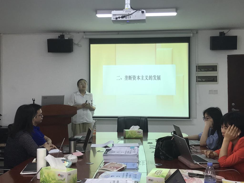 接着,由彭艺格主任进行教学展示。彭艺格主任围绕“垄断资本主义的发展”这一节内容进行了展示。她将教学内容分为“国家垄断资本主义的形成及作用”,“金融垄断资本的发展”“垄断资本向世界范围的扩展”和“垄断资本主义的实质”4个部分进行了讲解。彭老师教学准备充分,对于教材的理解十分透彻,在授课过程中既有对书本知识点的讲解,也由自身思考,理论联系实际,理论回应现实。授课中也设有互动环节,能够充分调动学生的积极性,使学生参与到课堂活动中。