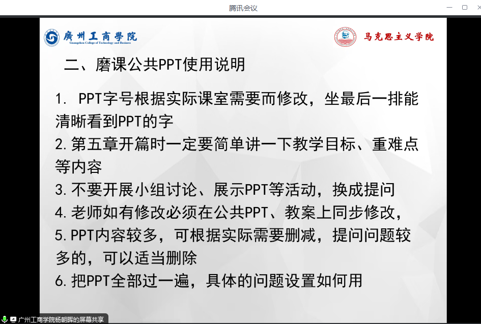 首先,杨朝晖主任向与会老师们详细解读了第十二周讲课的细化要求:第一,所有任课老师需提前准备好六大件:教学大纲、教案、教学进度表、点名册、讲稿,以备教研室审阅。第二,杨朝晖主任解析了使用磨课公共PPT时需注意的事项,如PPT字号根据实际课室需要修改,提问问题较多的可以适当删除等。第三、杨朝晖主任强调教案填写要规范,按要求准确填写,老师如有修改、案例如有替换,必须在PPT和教案上同步修改。第四、杨朝晖主任对讲稿及教学进度表进行说明。讲课过程中注意把握重难点,合理分配时间等。第五,杨朝晖主任对上课过程提出要求,教师和学生提前10分钟到课室进行学习通签到、手机入袋,靠前坐;讲课过程精神饱满,声音响亮,思路清晰,多走到学生中间调动学生的积极性,以最佳姿态展示授课。