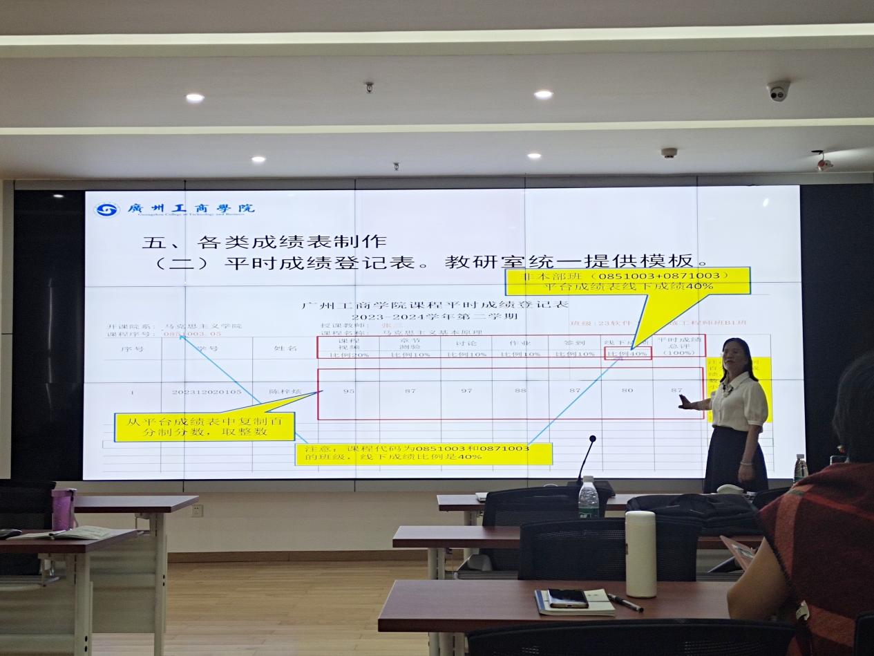然后,思想道德与法治课程教研室主任彭艺格老师进行了《原理》课期末线上技术培训。彭艺格主任向与会老师们介绍了成绩导出前准备并进行了实操演示。各项准备工作包括检查基本信息、线上平时学习任务完成情况、结课模式开启后再进行成绩导出等。随后,彭艺格主任针对平时成绩导出及制表的流程,进行了实操演示。各项流程包括课程论文成绩录入、线下学习成绩录入、平时成绩导出及平时成绩表制表、期末客观题成绩导出及期末成绩表制表。每一个步骤彭艺格主任都进行了实操演示,以便与会老师们更直观地掌握各项操作流程。