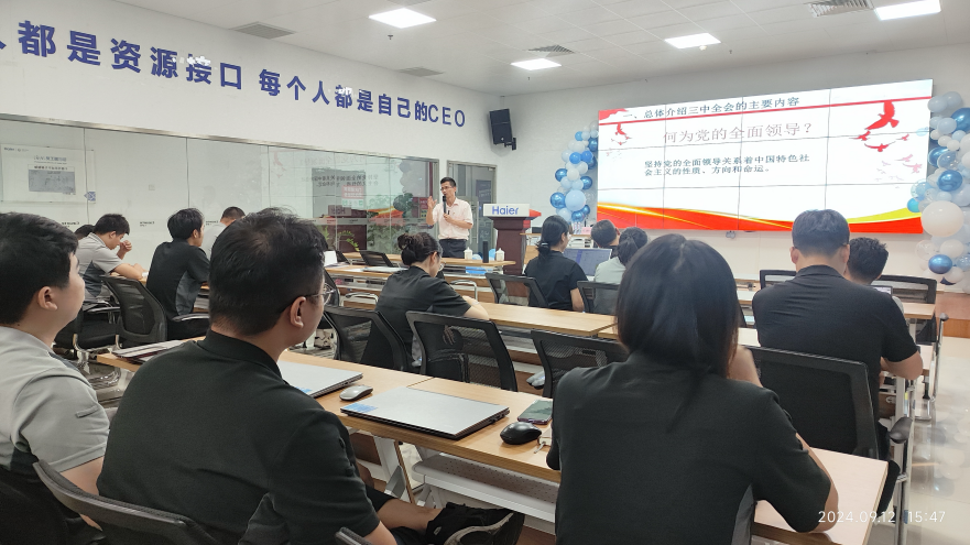 为全面学习宣传贯彻党的二十届三中全会精神,深入开展学习贯彻习近平新时代中国特色社会主义思想主题教育,确保三中全会精神在公司深入人心、落地生根,进一步激发全集团上下踔厉奋发、团结奋斗的精气神。beat365在线体育官网登录入口马克思主义学院党总支与佛高区三水园产业社区党委党建共建举办了学习贯彻党的二十届三中全会精神专题培训班。马克思主义学院宣讲团专家范国增副教授应邀于9月12日深入佛山海尔滚筒洗衣机有限公司开展题为《以践行三中全会精神 深化党纪学习教育 共筑企业高质量发展新篇章》的党的二十届三中全会精神专题党课讲座。