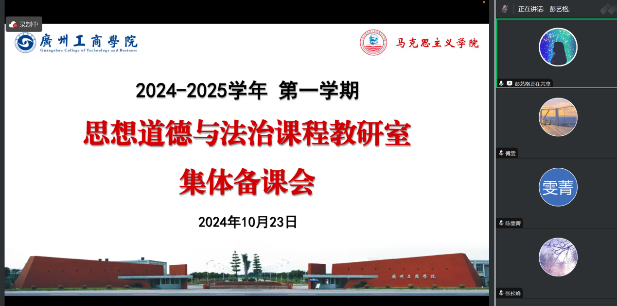 为学习贯彻党的二十届三中全会精神及习近平总书记关于学校思政课建设的重要指示精神,以党的创新理论为引领,激发思政课建设的新活力,进一步提高思政课的教学质量,思想道德与法治课程教研室于10月23日19:30通过线上腾讯会议平台成功召开了本学期的第四次集体备课会。此次备课会由教研室主任彭艺格老师主持,参与本次会议的有本学期德法课全体任课教师。会议旨在通过集体智慧的碰撞,共同探讨和分享教学经验,以期达到提升教学效果、丰富教学内容的目的。