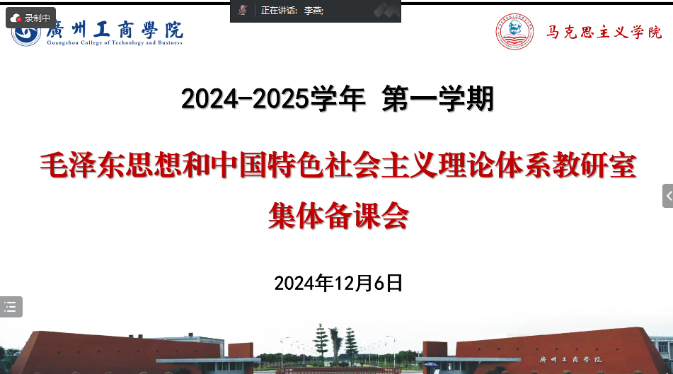 为深入学习贯彻党的二十届三中全会精神,更好落实立德树人根本任务,扎实推进教育教学改革,创新课堂教学理念,促进《毛泽东思想和中国特色社会主义理论体系概论》课程提质增效,充分发挥骨干教师的引领、示范作用,推动教育教学高质量发展。马克思主义学院毛泽东思想和中国特色社会主义理论体系概论教研室于2024年12月6日19:30在腾讯会议举行了本学期第四次集体备课会。本次会议由课程助理李燕老师主持,本学期担任毛泽东思想和中国特色社会主义理论体系概论课程的全体教师参加,共同深耕教学,赋能课堂。