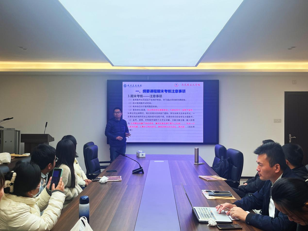 为深入学习贯彻党的二十届三中全会精神,全面落实学校及学院期末工作的各项要求,确保本学期期末考试顺利进行,马克思主义学院中国近现代史纲要课程教研室于12月20日下午在三水校区图书馆4楼张辉名师工作室召开期末工作部署会。会议由中国近现代史纲要教研室主任江振刚主持,本学期担任中国近现代史纲要课程的全体任课老师参加。