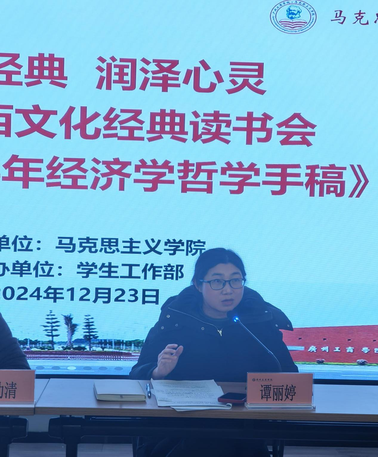 为全面深入学习贯彻党的二十届三中全会精神,贯彻落实习近平总书记关于读原著、学原文、悟原理的重要讲话精神,引导学生在阅读原著原文中收获知识、沉淀思考、学深悟透,全面提升学生的综合素质,12月23日晚上,学校研读《1844年经济学哲学手稿》活动在三水校区三综502学术报告厅举行。本次活动由马克思主义学院兼读书会指导老师李功清副教授领读,由读书会指导老师陈雯菁主持,马克思主义学院党总支副书记、院长助理谭丽婷老师讲话,大学生马克思主义理论研究读书会成员、学生工作部学生代表参加活动。