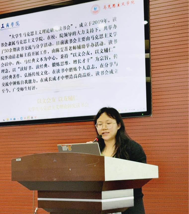 其次,读书会指导老师陈雯菁就读书会发展历程进行了讲解,鼓励同学们传习经典著作、弘扬传统文化,在读书中磨炼个人意志,在分享与交流中锤炼自我能力,在成长成才中塑造高尚品质。