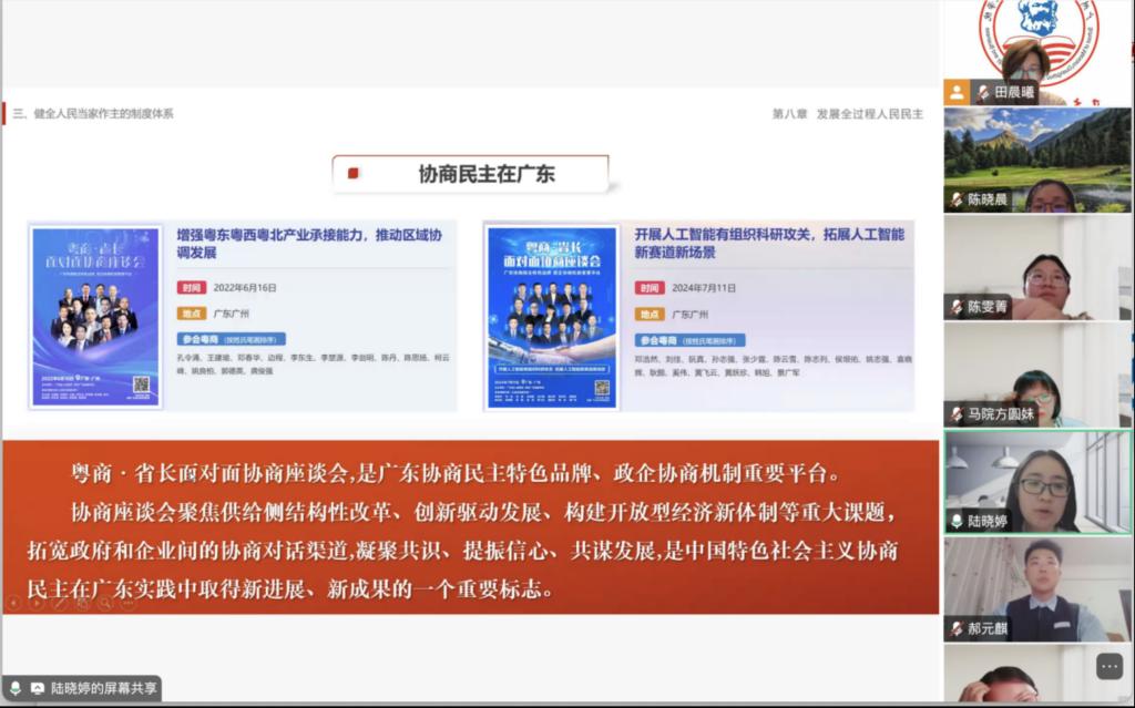 陆晓婷老师针对第八章内容,从广东实践出发,以广州南沙基层立法联系点、粤商·省长面对面协商座谈会等鲜活案例,对“什么是全过程人民民主”这一问题进行了详细解读,将抽象理论转化为可感知的民主实践,生动展现广东在协商民主和基层治理中的创新探索。