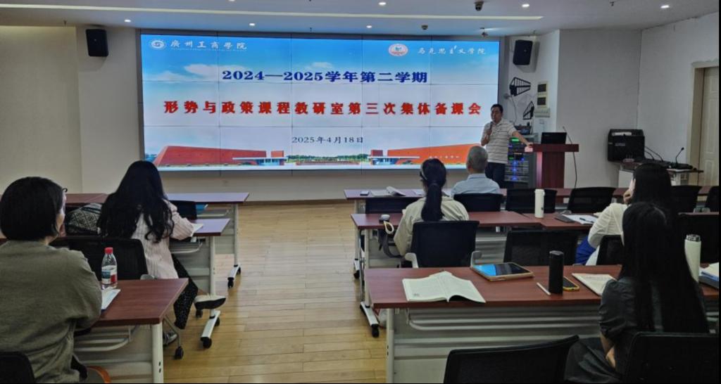 为进一步提升思政课教师专业素质和教学能力,丰富教学内容,创新教学方法,提高教学质量,马克思主义学院形势与政策课程教研室于2025年4月18日在三水校区院部楼525会议室召开了本学期第三次集体备课会。会议由教研室主任刘于亮老师主持,马克思主义学院副院长黄飞副教授以及本学期担任形势与政策课程的全体任课教师齐聚一堂,共同探讨教学新思路。
