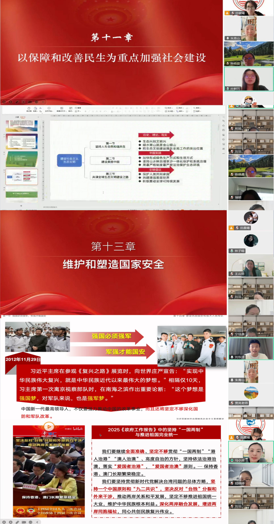叶桐润老师指出第十一章要讲清楚的三个问题:分别是“民生的重要性”“如何不断提高人民生活品质”以及“怎样让社会治理更加科学”。针对学生普遍关心的就业民生重点议题,叶老师则通过视频解析、典型案例、总书记金句摘编及互动研讨等多元化教学手段,系统阐释我国应对就业总量压力与结构性矛盾的制度优势,并引导学生辩证看待就业形势,树立正确的就业择业观。田晨曦老师通过思维导图分享了第十二章的整体框架,强调了在生态文明建设中,绿色发展理念的重要性以及生态文明建设与经济、社会、文化发展的紧密关系。通过详细讲述浙江余村成功转型的故事,能够更加直观地让学生理解生态文明建设的重要性,并激发他们将绿色发展理念融入日常行为的决心,为与会教师提供了宝贵参考。林子暄老师针对第十三章内容,通过国家安全部官微推出的微动漫《魔童归来!哪吒天团跨界守护国家安全》这一视频导入,引导学生认识维护国家安全的重要性。同时提供了诸多教学案例,以丰富教学内容,提升课堂教学的互动性和实效性。刘东洋老师系统梳理了第十四章的逻辑思路,并结合个人服役经历深入剖析国防和军队建设的重要意义。同时提出要坚持理论讲授与实际案例相结合,着力增强学生的国防观念和国家安全意识,激发青年学子投身国防事业的热情和责任感。马小淑老师重点分享了第十五章更新的内容,通过丰富的图片、数据和视频资料,详细展示了香港、澳门在“一国两制”方针下的繁荣发展,以及台湾问题的历史经纬和现状,引导学生思考如何在新的时代背景下维护国家主权和领土完整,激发学生的爱国情怀和民族自豪感。