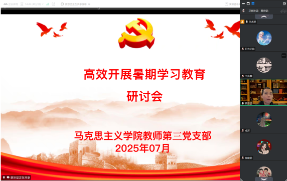 为深入贯彻中央八项规定精神学习教育,持续推进全面从严治党向基层延伸,强化党员干部的纪律意识与作风建设,7月25日,马克思主义学院教师第三党支部在线上召开党员大会。会议围绕暑期学习教育部署、专题学习研讨、作风查摆等议程展开,支部全体党员参加会议,支部书记蔡宗坚副教授主持会议。