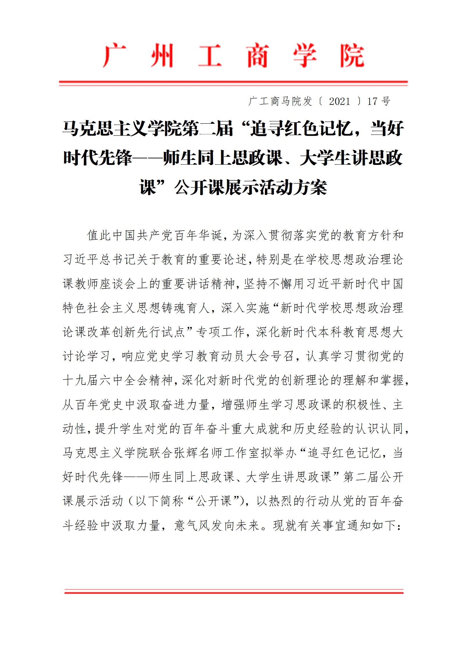 20211204 1_“广工商马院发〔 2021 〕17号:马克思主义学院第二届“追寻红色记忆,当好时代先锋——师生同上思政课、大学生讲思政课”公开课展示活动方案.docx