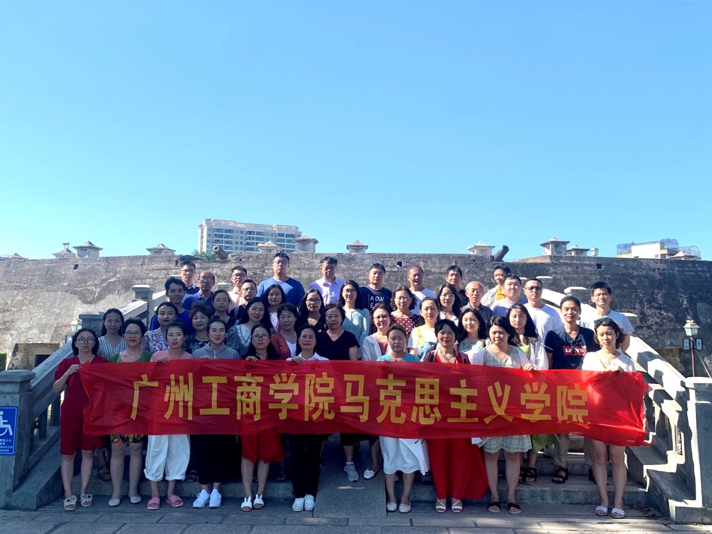 实践团第三站来到了位于汕头市的爱国主义教育基地——石炮台公园。该公园是以崎碌炮台遗址为主要景点的纪念性公园。崎碌炮台占地面积19607,为城堡式环形建筑物,炮台设计独特,是国内独立体规模最大,保存较为完好的一处清代军事设施。教师们驻足仔细游览炮台,并相互交流,既体会到该清代建筑的历史价值、科学价值和独特的艺术价值,又深深感受到我国人民坚决抵御外敌入侵,保卫神圣领土的爱国主义光荣传统。