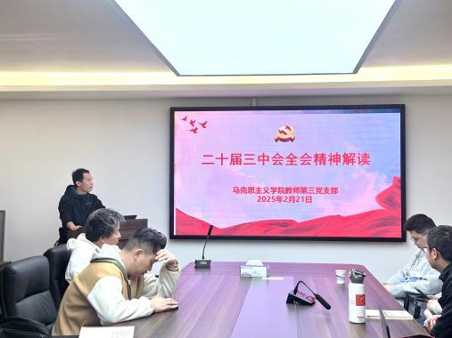 会议第三项议程由蔡书记作《深入学习贯彻党的二十届三中全会精神》专题党课。党课重点解读了全会关于健全全面从严治党体系、构建高质量教育体系等重大决策。通过对比分析历届三中全会的历史沿革,结合马克思主义学院工作实际,提出要在教学改革中探索"大思政课"建设新范式,在科研创新中聚焦党的理论创新成果阐释,真正将全会精神转化为推动工作的强大动力。