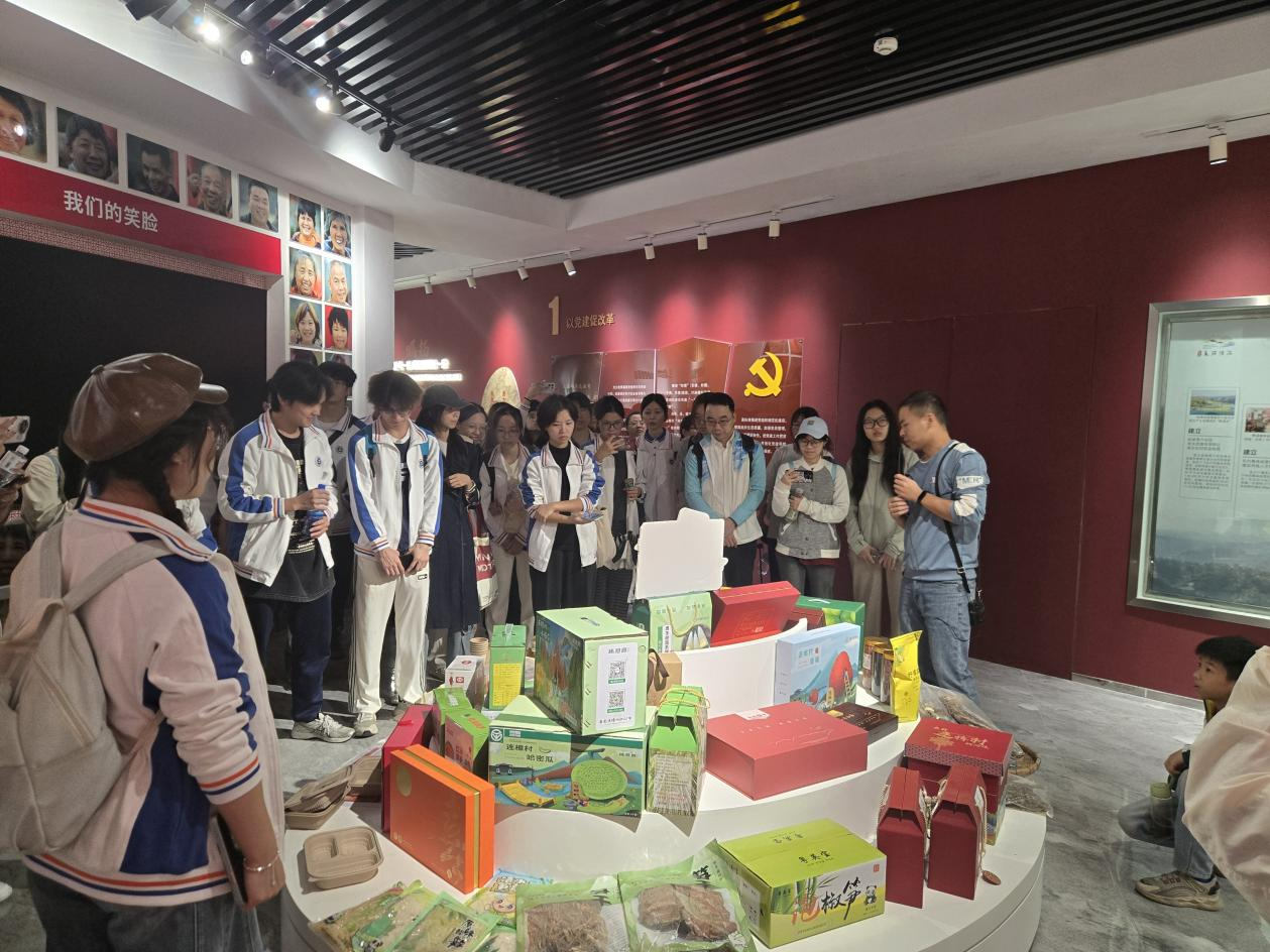 在连樟客厅中,墙上展陈的新旧照片形成鲜明对照:从“污水横流、房屋破旧”到“产业兴旺、生态宜居”,党建引领下的农村脱贫攻坚与乡村振兴实践历历在目。师生们走访了特色种养基地、村级电商服务站,并向讲解员细致询问农产品产销模式、村集体经济增收路径等核心问题。